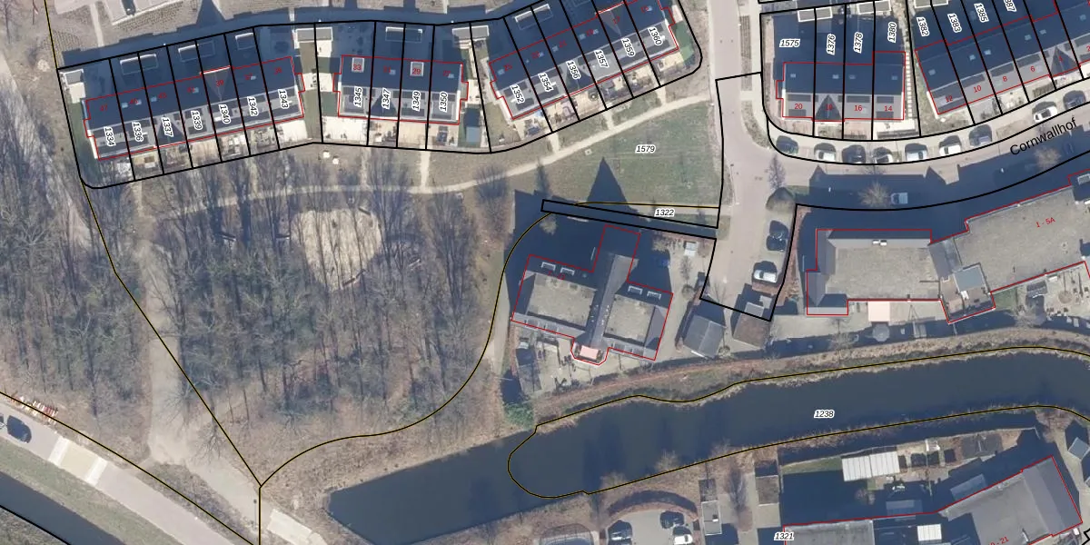 Het perceel waarop Cornwallhof 11 staat heeft een oppervlakte van 9661 m². Dit is een zeer groot perceel. De perceeloppervlakte wordt geregistreerd door het Kadaster. Gedetailleerde informatie over de maten van dit perceel kunt u vinden in het rapport Kadastrale kaart met maatvoering van Cornwallhof 11.