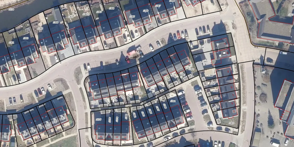 Het perceel waarop Cornwallhof 34 staat heeft een oppervlakte van 185 m². Dit is een middelgroot perceel. De perceeloppervlakte wordt geregistreerd door het Kadaster. Gedetailleerde informatie over de maten van dit perceel kunt u vinden in het rapport Kadastrale kaart met maatvoering van Cornwallhof 34.