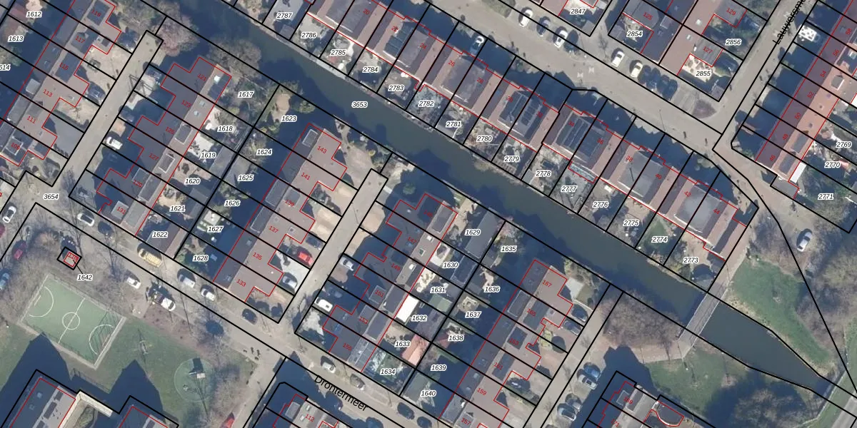 Het perceel waarop Drontermeer 145 staat heeft een oppervlakte van 350 m². Dit is een groot perceel. De perceeloppervlakte wordt geregistreerd door het Kadaster. Gedetailleerde informatie over de maten van dit perceel kunt u vinden in het rapport Kadastrale kaart met maatvoering van Drontermeer 145.