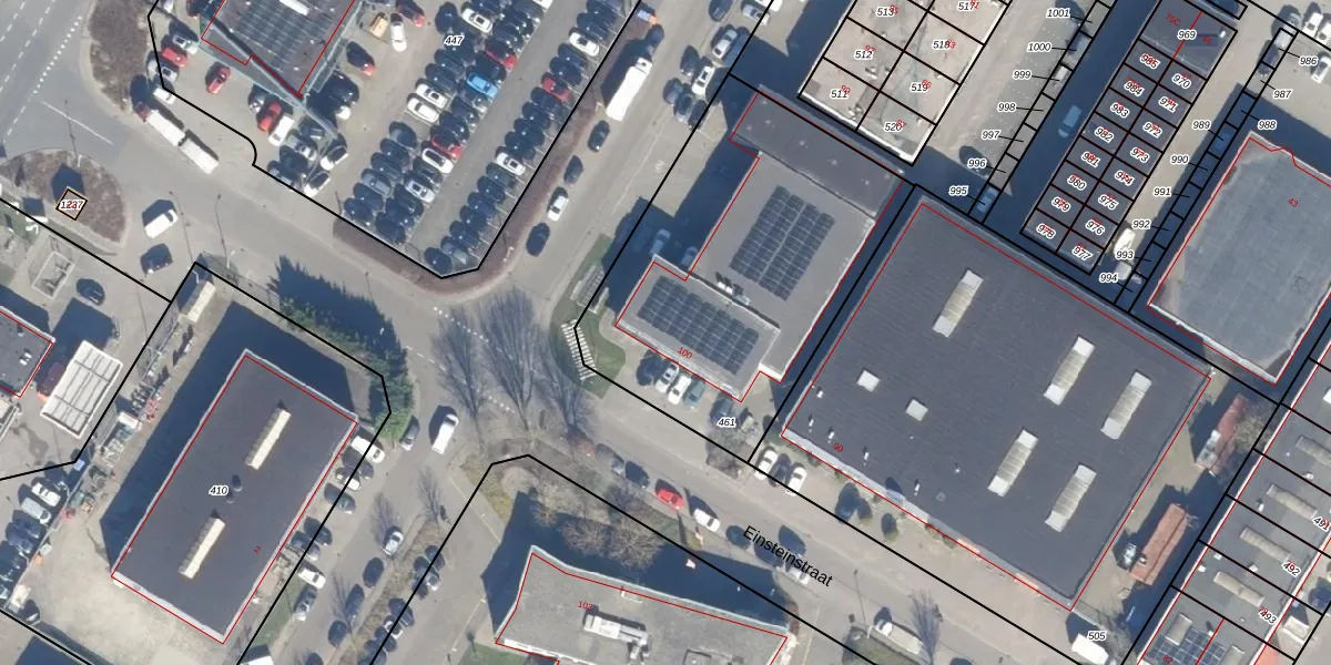 Einsteinstraat 100 is gelegen op kadastraal perceel PMR00I461. Deze kadastrale aanduiding is uniek en wordt gebruikt door het Kadaster om eigendomsrechten en andere zakelijke rechten vast te leggen. Het perceel maakt onderdeel uit van de kadastrale gemeente Purmerend.