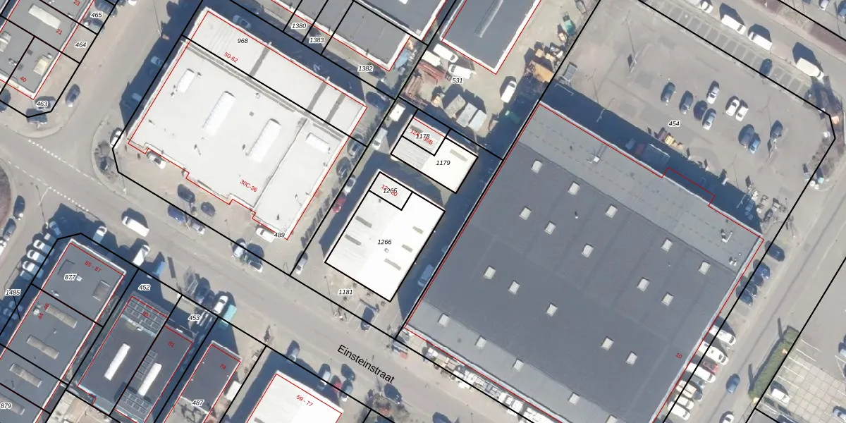 Het perceel waarop Einsteinstraat 12 staat heeft een oppervlakte van 404 m². Dit is een groot perceel. De perceeloppervlakte wordt geregistreerd door het Kadaster. Gedetailleerde informatie over de maten van dit perceel kunt u vinden in het rapport Kadastrale kaart met maatvoering van Einsteinstraat 12.