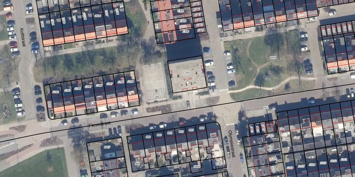 Het perceel waarop Flevostraat 95 staat heeft een oppervlakte van 356 m². Dit is een groot perceel. De perceeloppervlakte wordt geregistreerd door het Kadaster. Gedetailleerde informatie over de maten van dit perceel kunt u vinden in het rapport Kadastrale kaart met maatvoering van Flevostraat 95.