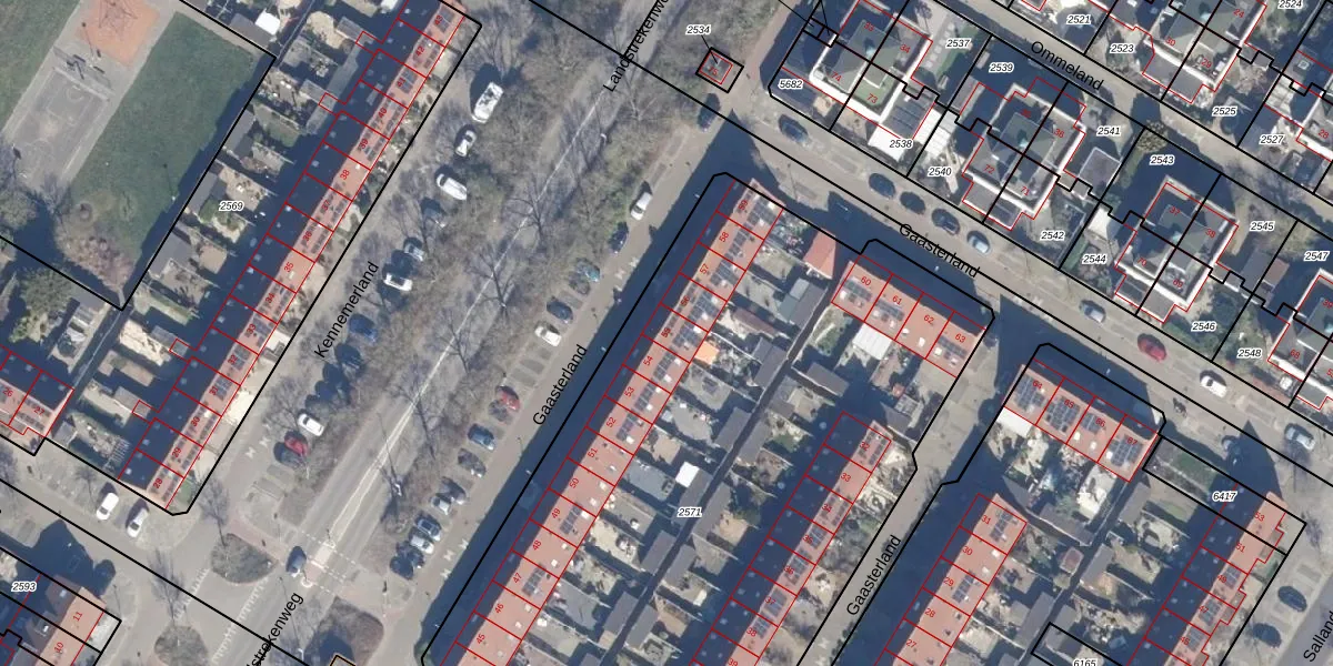 Het perceel waarop Gaasterland 55 staat heeft een oppervlakte van 4267 m². Dit is een zeer groot perceel. De perceeloppervlakte wordt geregistreerd door het Kadaster. Gedetailleerde informatie over de maten van dit perceel kunt u vinden in het rapport Kadastrale kaart met maatvoering van Gaasterland 55.