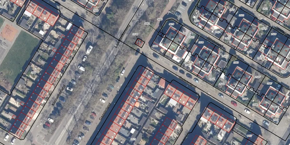 Het perceel waarop Gaasterland 59 staat heeft een oppervlakte van 4267 m². Dit is een zeer groot perceel. De perceeloppervlakte wordt geregistreerd door het Kadaster. Gedetailleerde informatie over de maten van dit perceel kunt u vinden in het rapport Kadastrale kaart met maatvoering van Gaasterland 59.