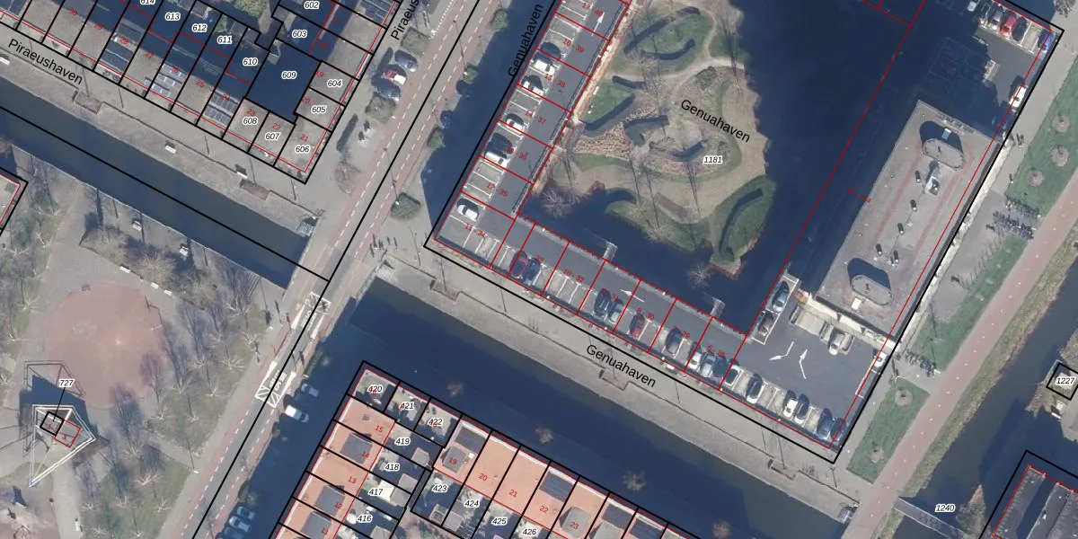 Het perceel waarop Genuahaven 33 staat heeft een oppervlakte van 7825 m². Dit is een zeer groot perceel. De perceeloppervlakte wordt geregistreerd door het Kadaster. Gedetailleerde informatie over de maten van dit perceel kunt u vinden in het rapport Kadastrale kaart met maatvoering van Genuahaven 33.