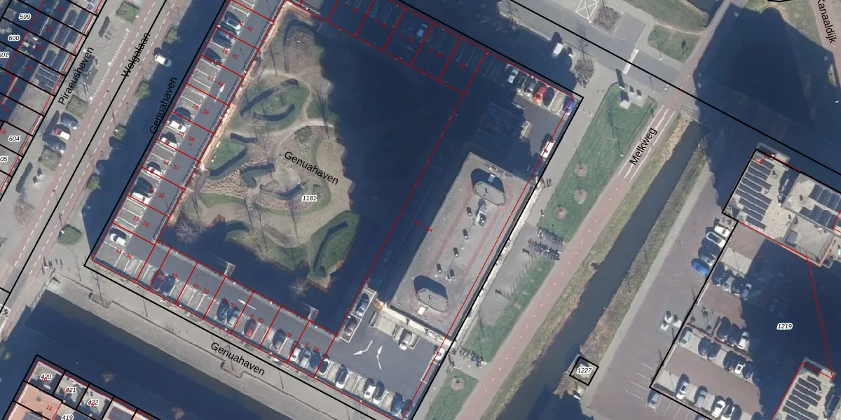Het perceel waarop Genuahaven 49 staat heeft een oppervlakte van 7825 m². Dit is een zeer groot perceel. De perceeloppervlakte wordt geregistreerd door het Kadaster. Gedetailleerde informatie over de maten van dit perceel kunt u vinden in het rapport Kadastrale kaart met maatvoering van Genuahaven 49.