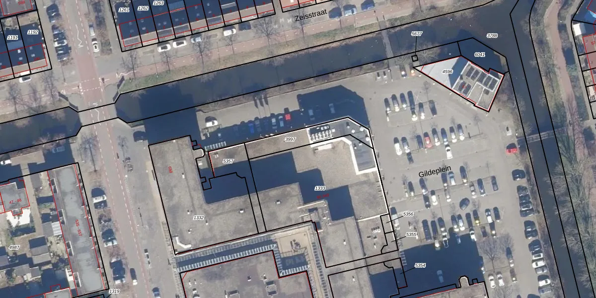 Het perceel waarop Gildeplein 101 staat heeft een oppervlakte van 1383 m². Dit is een zeer groot perceel. De perceeloppervlakte wordt geregistreerd door het Kadaster. Gedetailleerde informatie over de maten van dit perceel kunt u vinden in het rapport Kadastrale kaart met maatvoering van Gildeplein 101.