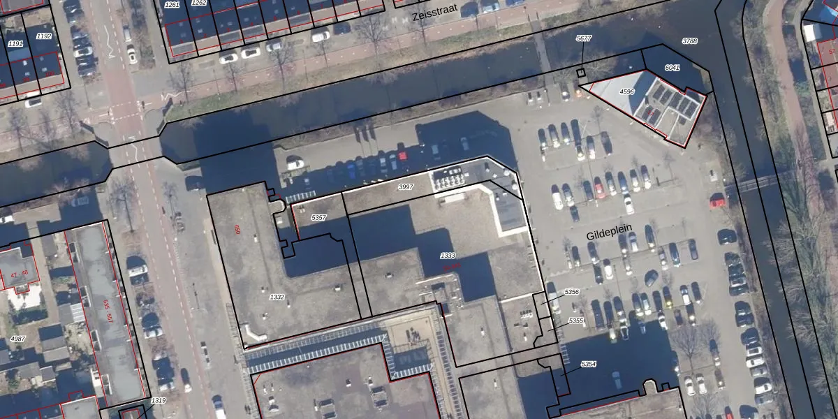 Het perceel waarop Gildeplein 105 staat heeft een oppervlakte van 1383 m². Dit is een zeer groot perceel. De perceeloppervlakte wordt geregistreerd door het Kadaster. Gedetailleerde informatie over de maten van dit perceel kunt u vinden in het rapport Kadastrale kaart met maatvoering van Gildeplein 105.