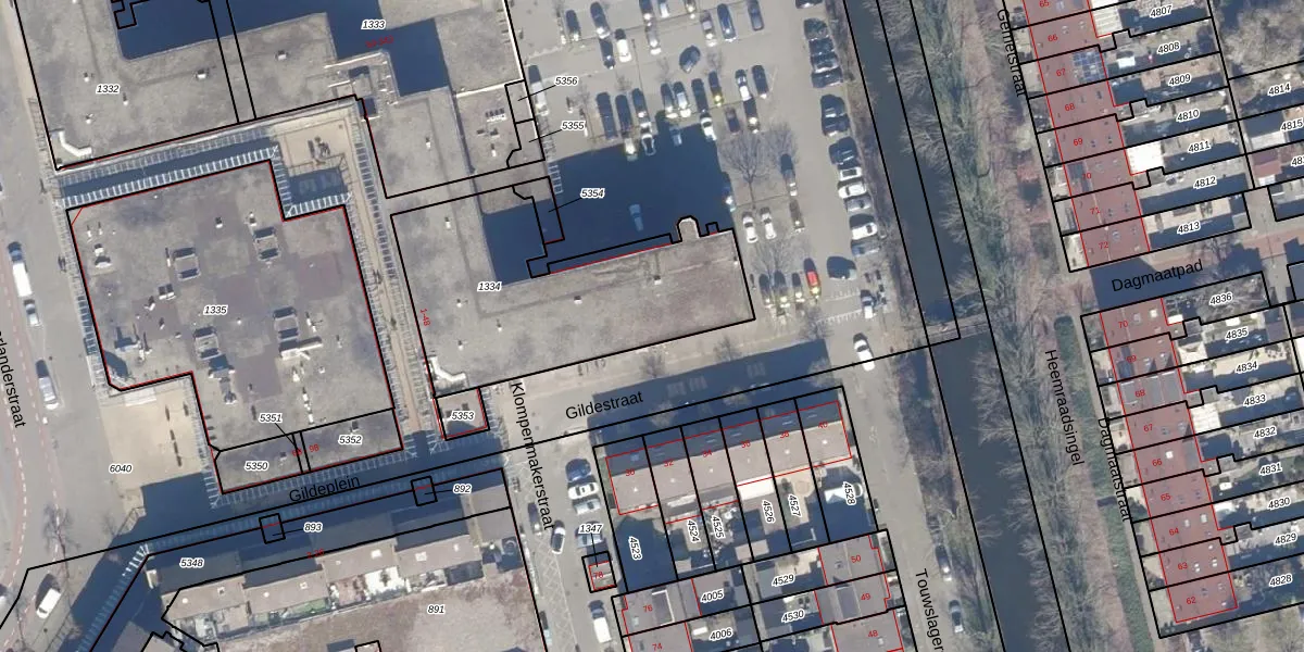 Het perceel waarop Gildeplein 5 staat heeft een oppervlakte van 1066 m². Dit is een zeer groot perceel. De perceeloppervlakte wordt geregistreerd door het Kadaster. Gedetailleerde informatie over de maten van dit perceel kunt u vinden in het rapport Kadastrale kaart met maatvoering van Gildeplein 5.