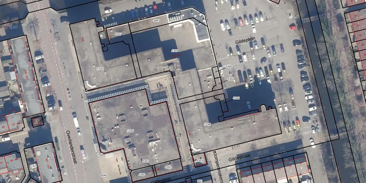 Het perceel waarop Gildeplein 50 staat heeft een oppervlakte van 1383 m². Dit is een zeer groot perceel. De perceeloppervlakte wordt geregistreerd door het Kadaster. Gedetailleerde informatie over de maten van dit perceel kunt u vinden in het rapport Kadastrale kaart met maatvoering van Gildeplein 50.