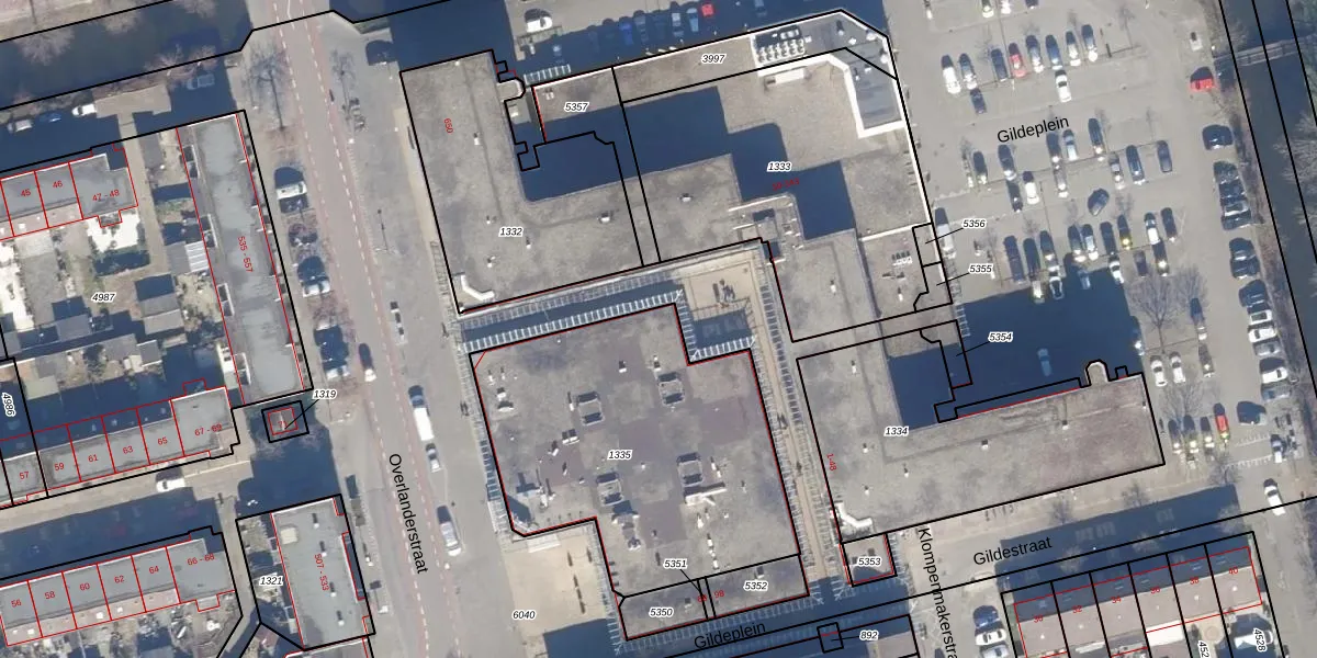 Het perceel waarop Gildeplein 76 staat heeft een oppervlakte van 1476 m². Dit is een zeer groot perceel. De perceeloppervlakte wordt geregistreerd door het Kadaster. Gedetailleerde informatie over de maten van dit perceel kunt u vinden in het rapport Kadastrale kaart met maatvoering van Gildeplein 76.