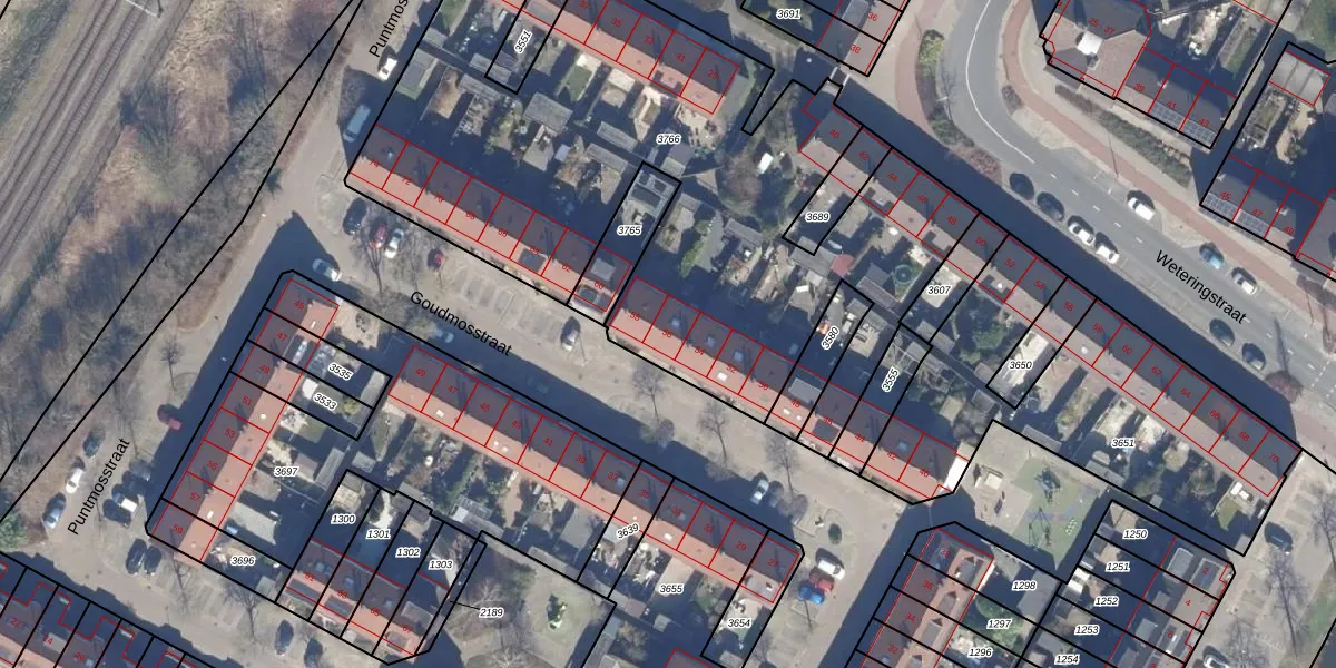 Het perceel waarop Goudmosstraat 56 staat heeft een oppervlakte van 3326 m². Dit is een zeer groot perceel. De perceeloppervlakte wordt geregistreerd door het Kadaster. Gedetailleerde informatie over de maten van dit perceel kunt u vinden in het rapport Kadastrale kaart met maatvoering van Goudmosstraat 56.