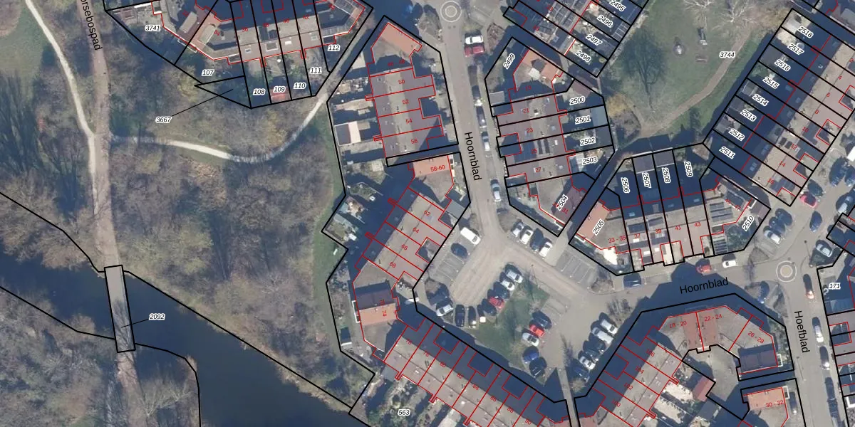 Het perceel waarop Hoornblad 62 staat heeft een oppervlakte van 3066 m². Dit is een zeer groot perceel. De perceeloppervlakte wordt geregistreerd door het Kadaster. Gedetailleerde informatie over de maten van dit perceel kunt u vinden in het rapport Kadastrale kaart met maatvoering van Hoornblad 62.