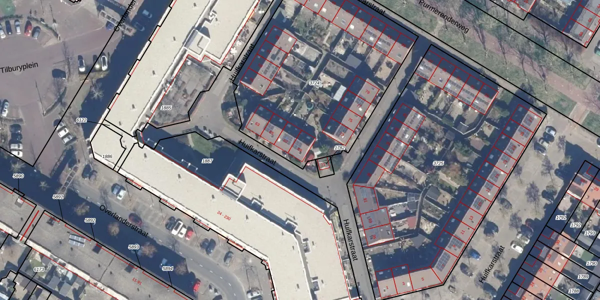 Het perceel waarop Huifkarstraat 69 staat heeft een oppervlakte van 2449 m². Dit is een zeer groot perceel. De perceeloppervlakte wordt geregistreerd door het Kadaster. Gedetailleerde informatie over de maten van dit perceel kunt u vinden in het rapport Kadastrale kaart met maatvoering van Huifkarstraat 69.