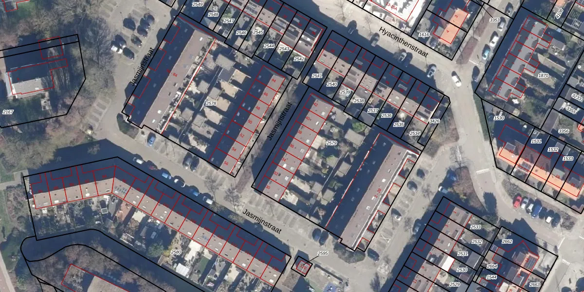 Het perceel waarop Jasmijnstraat 36 staat heeft een oppervlakte van 1764 m². Dit is een zeer groot perceel. De perceeloppervlakte wordt geregistreerd door het Kadaster. Gedetailleerde informatie over de maten van dit perceel kunt u vinden in het rapport Kadastrale kaart met maatvoering van Jasmijnstraat 36.