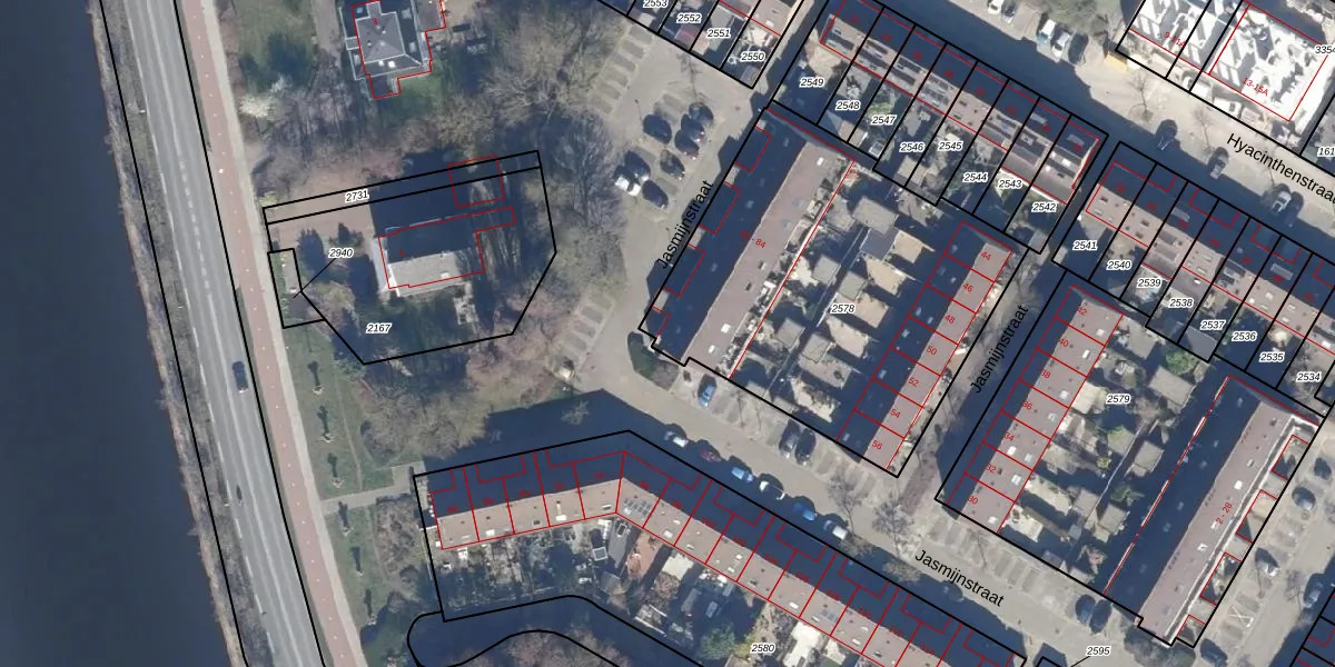 Het perceel waarop Jasmijnstraat 84 staat heeft een oppervlakte van 1767 m². Dit is een zeer groot perceel. De perceeloppervlakte wordt geregistreerd door het Kadaster. Gedetailleerde informatie over de maten van dit perceel kunt u vinden in het rapport Kadastrale kaart met maatvoering van Jasmijnstraat 84.