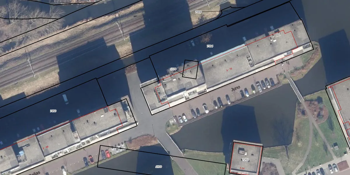 Het perceel waarop Juno 65 staat heeft een oppervlakte van 2860 m². Dit is een zeer groot perceel. De perceeloppervlakte wordt geregistreerd door het Kadaster. Gedetailleerde informatie over de maten van dit perceel kunt u vinden in het rapport Kadastrale kaart met maatvoering van Juno 65.
