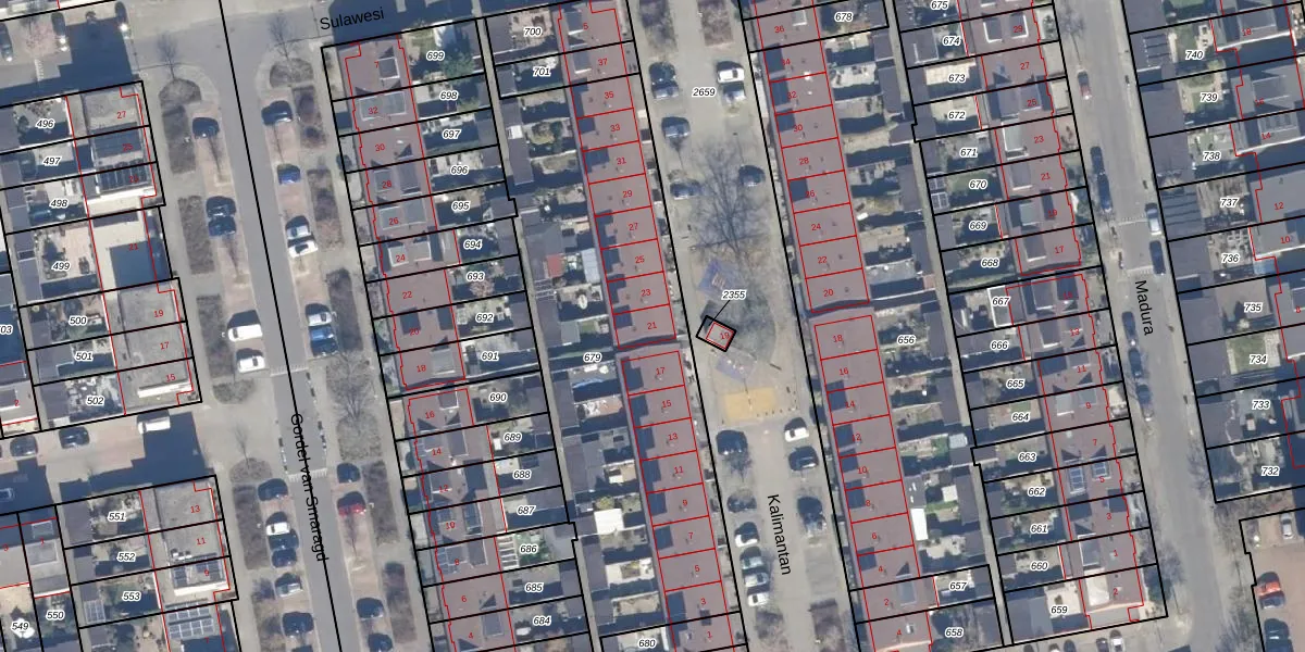 Het perceel waarop Kalimantan 21 staat heeft een oppervlakte van 1997 m². Dit is een zeer groot perceel. De perceeloppervlakte wordt geregistreerd door het Kadaster. Gedetailleerde informatie over de maten van dit perceel kunt u vinden in het rapport Kadastrale kaart met maatvoering van Kalimantan 21.