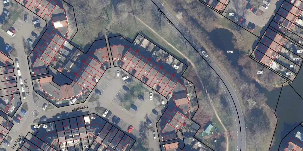 Het perceel waarop Lepelblad 97 staat heeft een oppervlakte van 2618 m². Dit is een zeer groot perceel. De perceeloppervlakte wordt geregistreerd door het Kadaster. Gedetailleerde informatie over de maten van dit perceel kunt u vinden in het rapport Kadastrale kaart met maatvoering van Lepelblad 97.