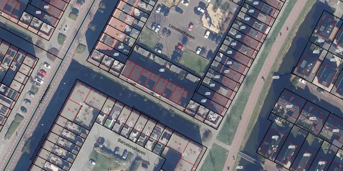 Het perceel waarop Lissabonhaven 27 staat heeft een oppervlakte van 960 m². Dit is een groot perceel. De perceeloppervlakte wordt geregistreerd door het Kadaster. Gedetailleerde informatie over de maten van dit perceel kunt u vinden in het rapport Kadastrale kaart met maatvoering van Lissabonhaven 27.