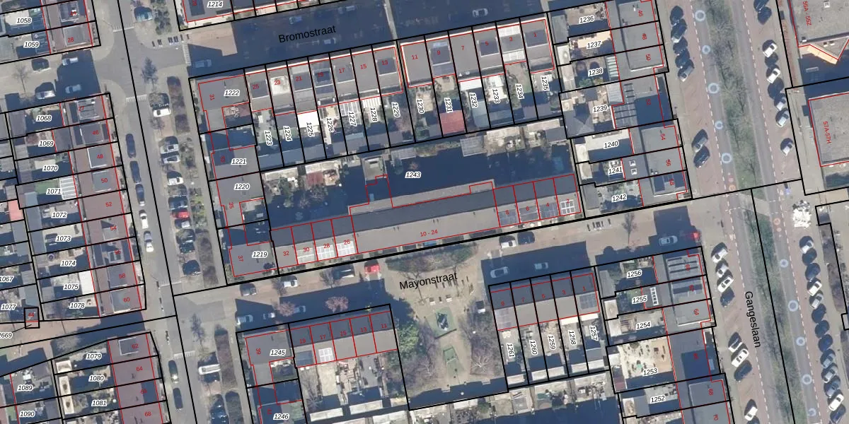Het perceel waarop Mayonstraat 18 staat heeft een oppervlakte van 1815 m². Dit is een zeer groot perceel. De perceeloppervlakte wordt geregistreerd door het Kadaster. Gedetailleerde informatie over de maten van dit perceel kunt u vinden in het rapport Kadastrale kaart met maatvoering van Mayonstraat 18.
