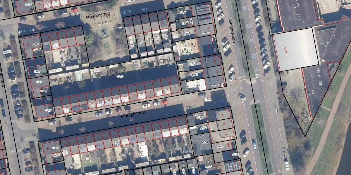 Het perceel waarop Merapistraat 2 staat heeft een oppervlakte van 2397 m². Dit is een zeer groot perceel. De perceeloppervlakte wordt geregistreerd door het Kadaster. Gedetailleerde informatie over de maten van dit perceel kunt u vinden in het rapport Kadastrale kaart met maatvoering van Merapistraat 2.