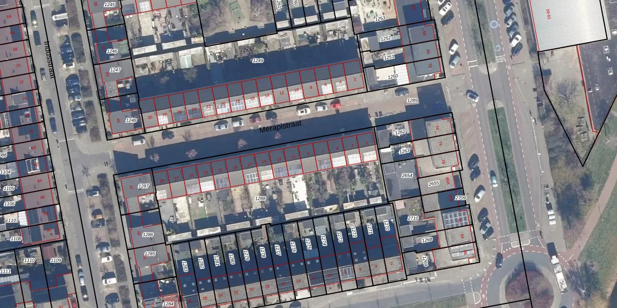 Het perceel waarop Merapistraat 9 staat heeft een oppervlakte van 1864 m². Dit is een zeer groot perceel. De perceeloppervlakte wordt geregistreerd door het Kadaster. Gedetailleerde informatie over de maten van dit perceel kunt u vinden in het rapport Kadastrale kaart met maatvoering van Merapistraat 9.
