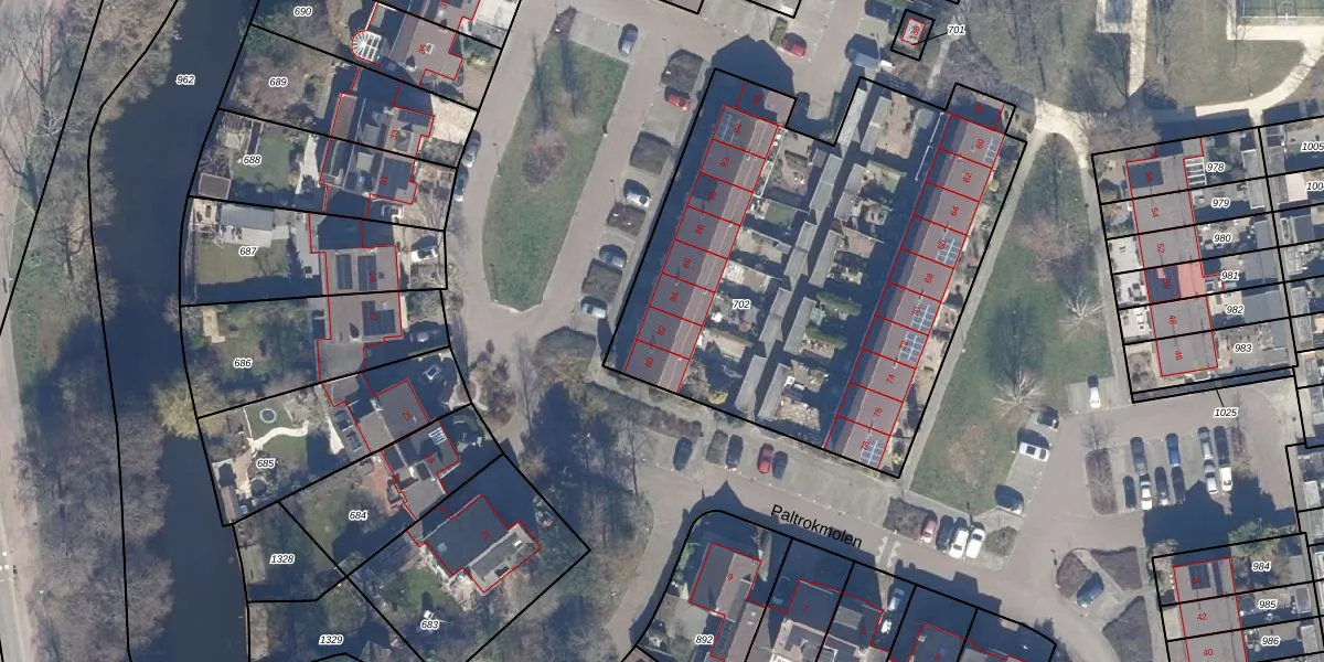 Het perceel waarop Paltrokmolen 82 staat heeft een oppervlakte van 2480 m². Dit is een zeer groot perceel. De perceeloppervlakte wordt geregistreerd door het Kadaster. Gedetailleerde informatie over de maten van dit perceel kunt u vinden in het rapport Kadastrale kaart met maatvoering van Paltrokmolen 82.