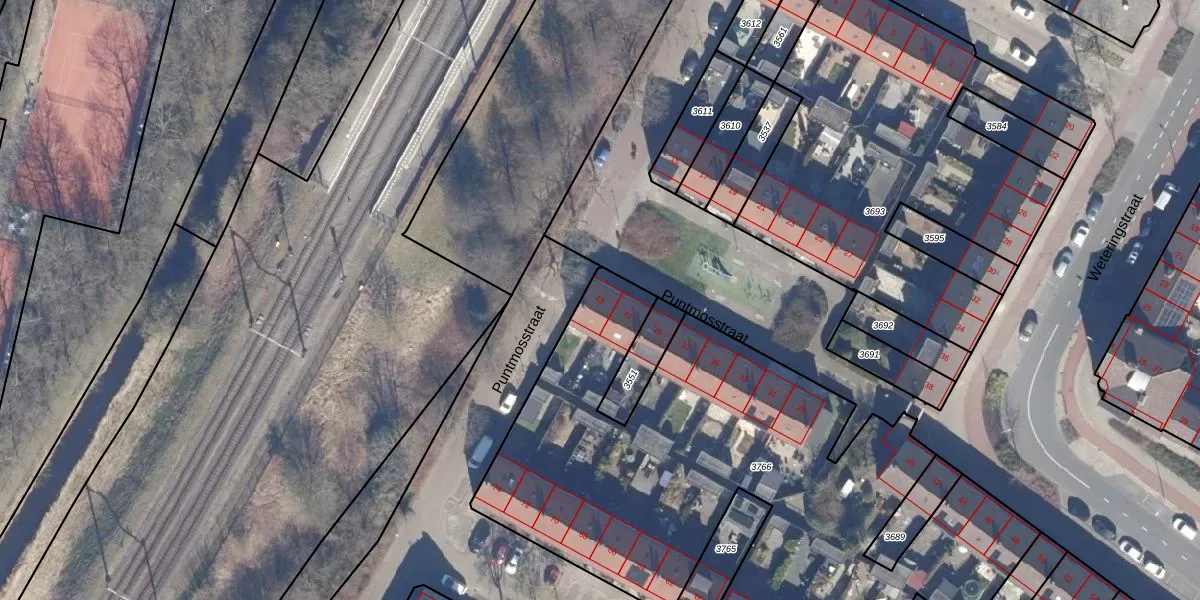 Het perceel waarop Puntmosstraat 43 staat heeft een oppervlakte van 3326 m². Dit is een zeer groot perceel. De perceeloppervlakte wordt geregistreerd door het Kadaster. Gedetailleerde informatie over de maten van dit perceel kunt u vinden in het rapport Kadastrale kaart met maatvoering van Puntmosstraat 43.