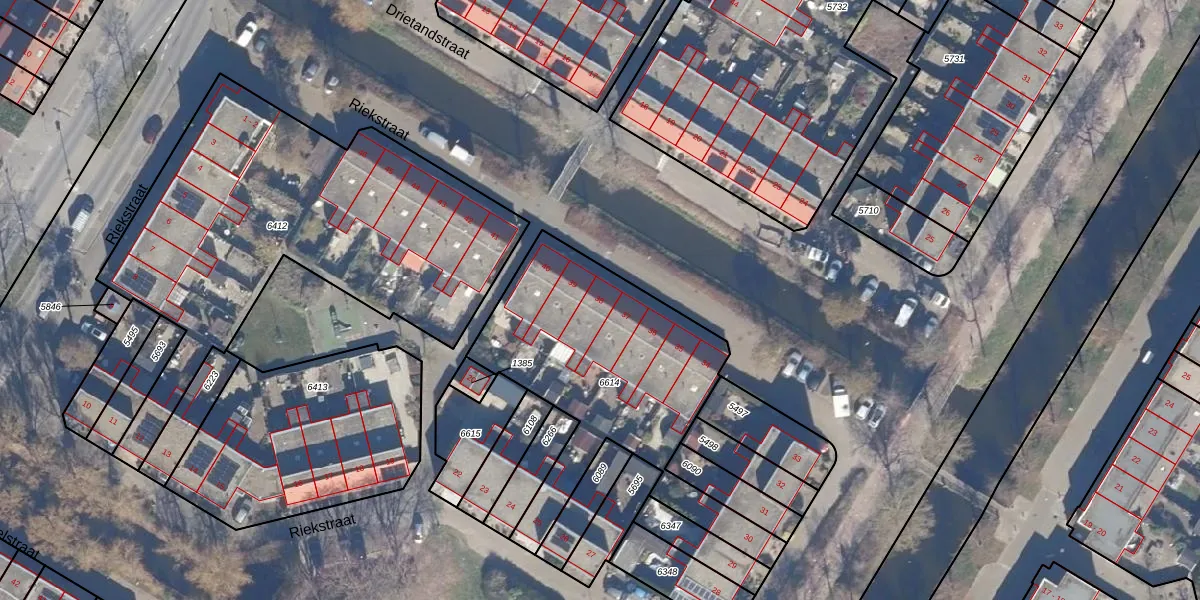 Het perceel waarop Riekstraat 38 staat heeft een oppervlakte van 1152 m². Dit is een zeer groot perceel. De perceeloppervlakte wordt geregistreerd door het Kadaster. Gedetailleerde informatie over de maten van dit perceel kunt u vinden in het rapport Kadastrale kaart met maatvoering van Riekstraat 38.