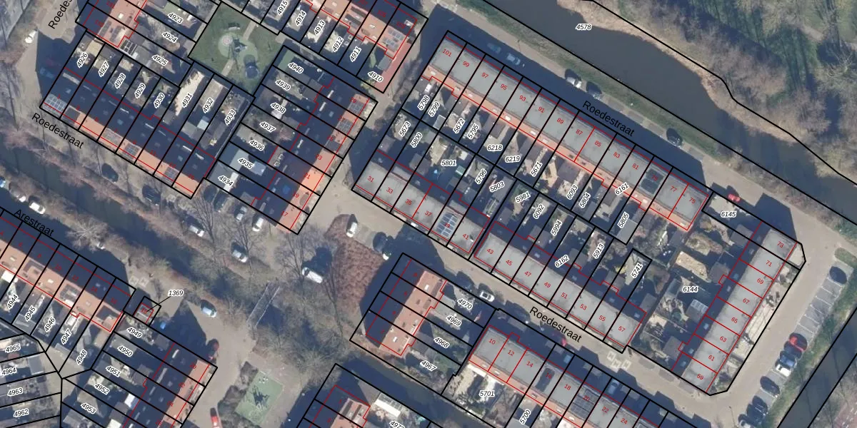Het perceel waarop Roedestraat 37 staat heeft een oppervlakte van 226 m². Dit is een middelgroot perceel. De perceeloppervlakte wordt geregistreerd door het Kadaster. Gedetailleerde informatie over de maten van dit perceel kunt u vinden in het rapport Kadastrale kaart met maatvoering van Roedestraat 37.