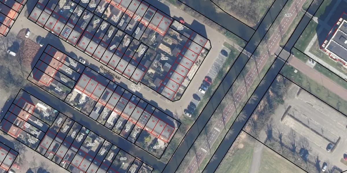 Het perceel waarop Roedestraat 61 staat heeft een oppervlakte van 1399 m². Dit is een zeer groot perceel. De perceeloppervlakte wordt geregistreerd door het Kadaster. Gedetailleerde informatie over de maten van dit perceel kunt u vinden in het rapport Kadastrale kaart met maatvoering van Roedestraat 61.