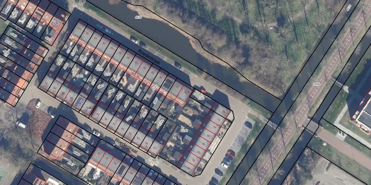 Het perceel waarop Roedestraat 75 staat heeft een oppervlakte van 1399 m². Dit is een zeer groot perceel. De perceeloppervlakte wordt geregistreerd door het Kadaster. Gedetailleerde informatie over de maten van dit perceel kunt u vinden in het rapport Kadastrale kaart met maatvoering van Roedestraat 75.