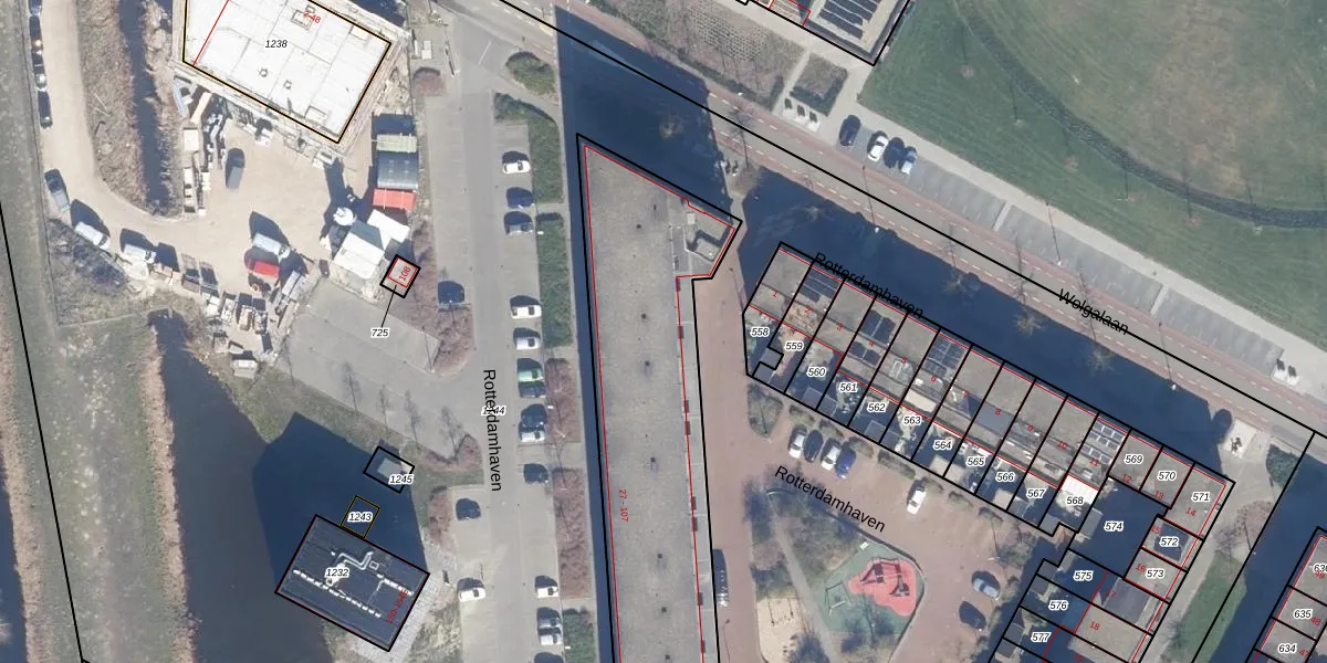 Het perceel waarop Rotterdamhaven 106 staat heeft een oppervlakte van 2490 m². Dit is een zeer groot perceel. De perceeloppervlakte wordt geregistreerd door het Kadaster. Gedetailleerde informatie over de maten van dit perceel kunt u vinden in het rapport Kadastrale kaart met maatvoering van Rotterdamhaven 106.