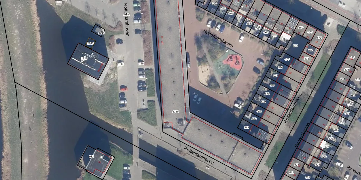 Het perceel waarop Rotterdamhaven 97 staat heeft een oppervlakte van 2490 m². Dit is een zeer groot perceel. De perceeloppervlakte wordt geregistreerd door het Kadaster. Gedetailleerde informatie over de maten van dit perceel kunt u vinden in het rapport Kadastrale kaart met maatvoering van Rotterdamhaven 97.