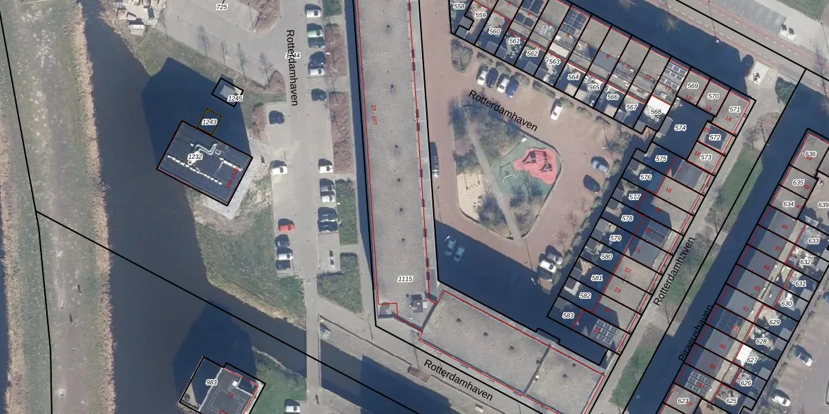 Het perceel waarop Rotterdamhaven 98 staat heeft een oppervlakte van 2490 m². Dit is een zeer groot perceel. De perceeloppervlakte wordt geregistreerd door het Kadaster. Gedetailleerde informatie over de maten van dit perceel kunt u vinden in het rapport Kadastrale kaart met maatvoering van Rotterdamhaven 98.