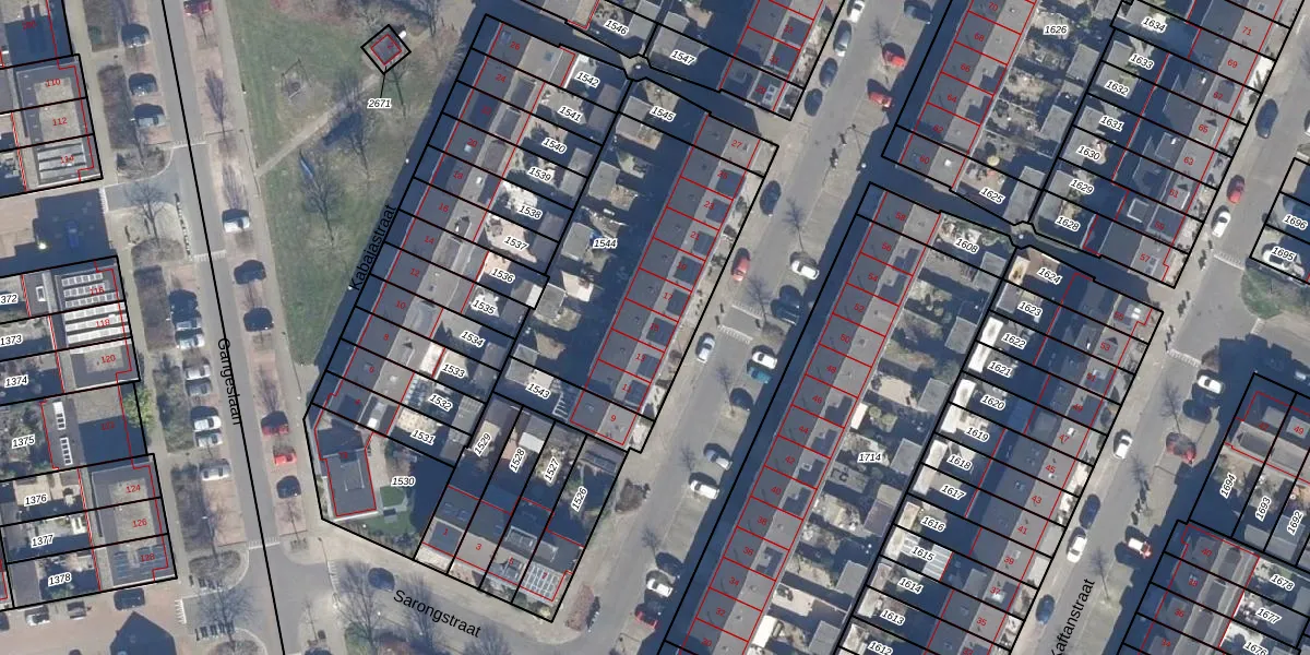 Het perceel waarop Sarongstraat 15 staat heeft een oppervlakte van 996 m². Dit is een groot perceel. De perceeloppervlakte wordt geregistreerd door het Kadaster. Gedetailleerde informatie over de maten van dit perceel kunt u vinden in het rapport Kadastrale kaart met maatvoering van Sarongstraat 15.