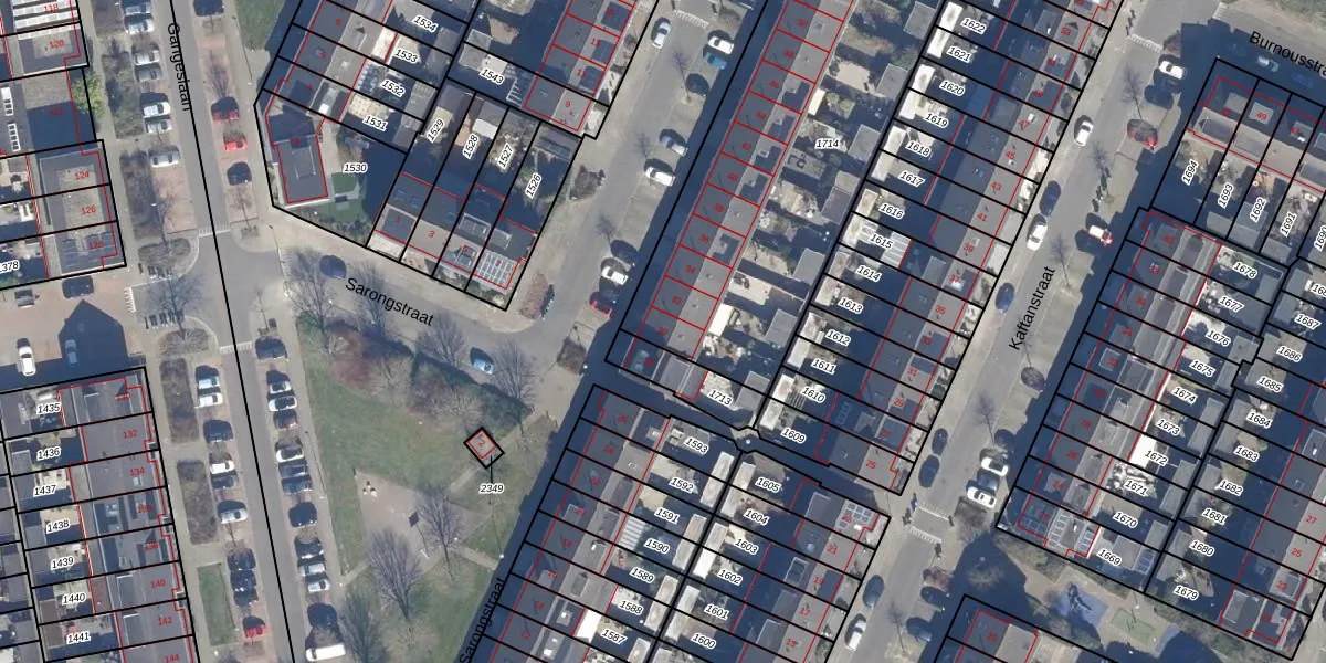 Het perceel waarop Sarongstraat 30 staat heeft een oppervlakte van 1750 m². Dit is een zeer groot perceel. De perceeloppervlakte wordt geregistreerd door het Kadaster. Gedetailleerde informatie over de maten van dit perceel kunt u vinden in het rapport Kadastrale kaart met maatvoering van Sarongstraat 30.