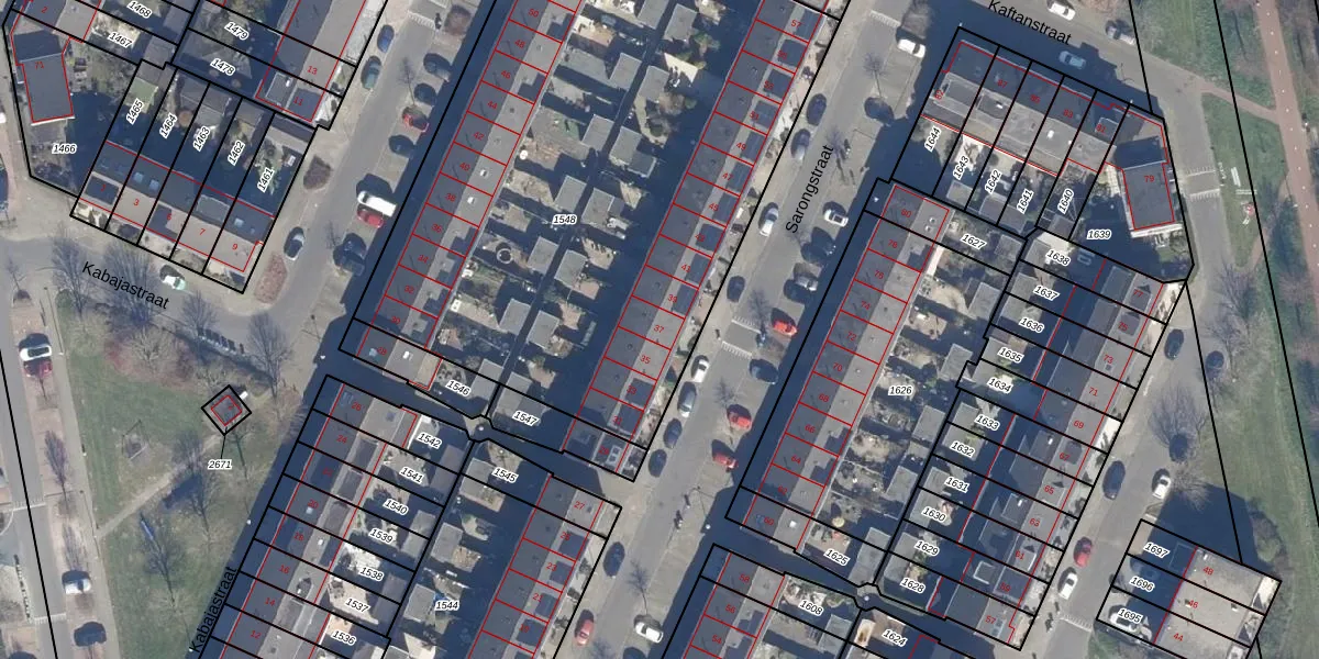 Het perceel waarop Sarongstraat 37 staat heeft een oppervlakte van 3498 m². Dit is een zeer groot perceel. De perceeloppervlakte wordt geregistreerd door het Kadaster. Gedetailleerde informatie over de maten van dit perceel kunt u vinden in het rapport Kadastrale kaart met maatvoering van Sarongstraat 37.