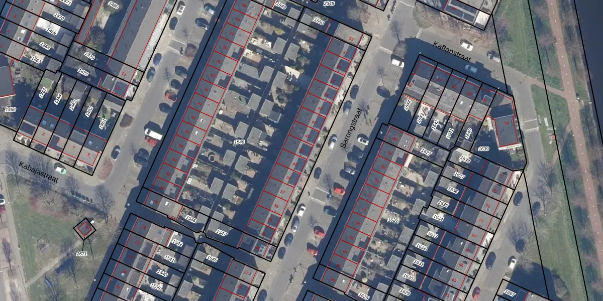 Het perceel waarop Sarongstraat 43 staat heeft een oppervlakte van 3498 m². Dit is een zeer groot perceel. De perceeloppervlakte wordt geregistreerd door het Kadaster. Gedetailleerde informatie over de maten van dit perceel kunt u vinden in het rapport Kadastrale kaart met maatvoering van Sarongstraat 43.