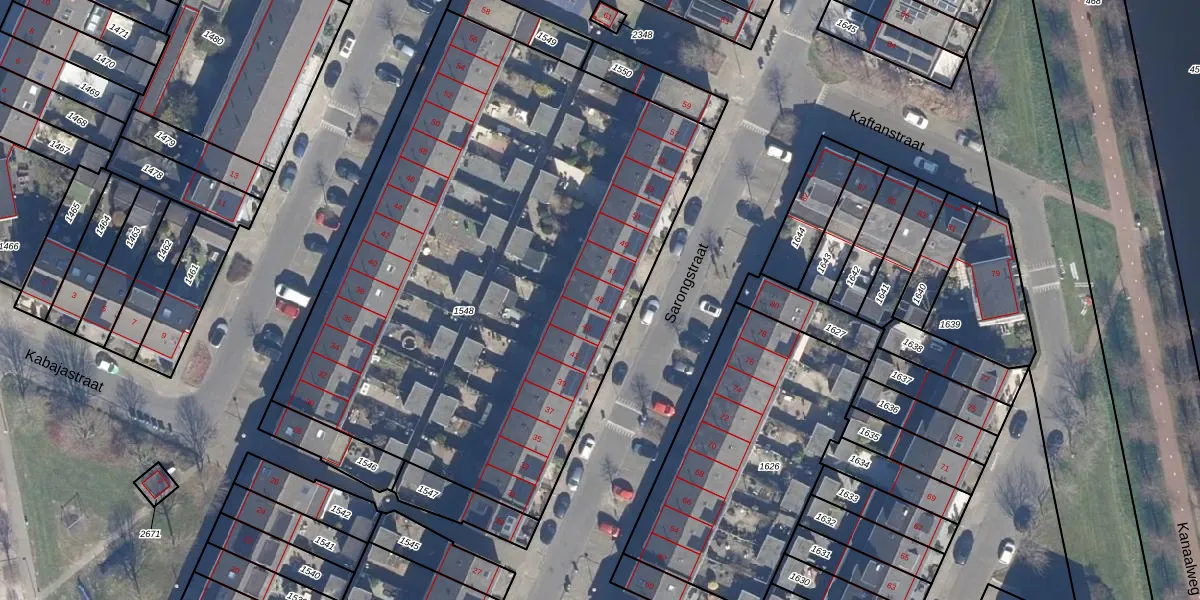 Het perceel waarop Sarongstraat 45 staat heeft een oppervlakte van 3498 m². Dit is een zeer groot perceel. De perceeloppervlakte wordt geregistreerd door het Kadaster. Gedetailleerde informatie over de maten van dit perceel kunt u vinden in het rapport Kadastrale kaart met maatvoering van Sarongstraat 45.