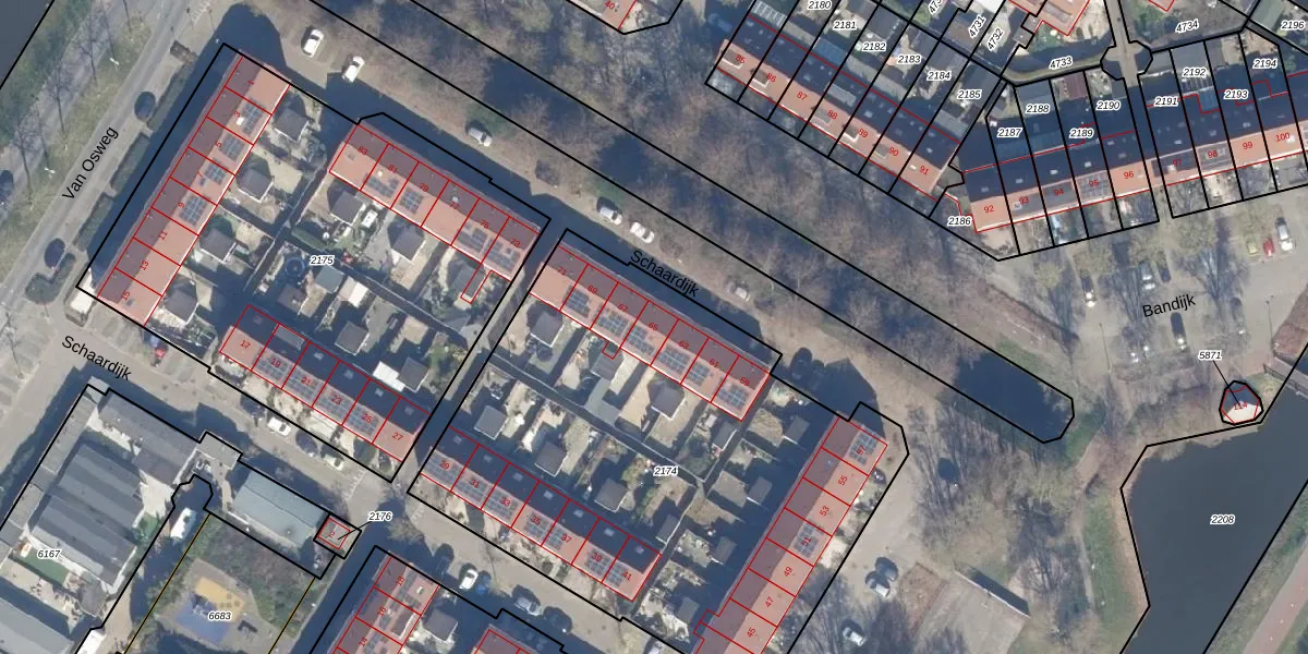 Het perceel waarop Schaardijk 65 staat heeft een oppervlakte van 2902 m². Dit is een zeer groot perceel. De perceeloppervlakte wordt geregistreerd door het Kadaster. Gedetailleerde informatie over de maten van dit perceel kunt u vinden in het rapport Kadastrale kaart met maatvoering van Schaardijk 65.