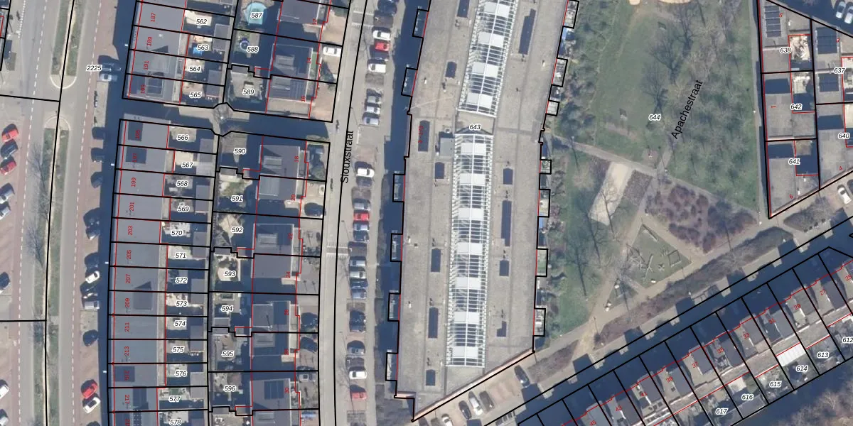 Het perceel waarop Siouxstraat 107 staat heeft een oppervlakte van 3945 m². Dit is een zeer groot perceel. De perceeloppervlakte wordt geregistreerd door het Kadaster. Gedetailleerde informatie over de maten van dit perceel kunt u vinden in het rapport Kadastrale kaart met maatvoering van Siouxstraat 107.