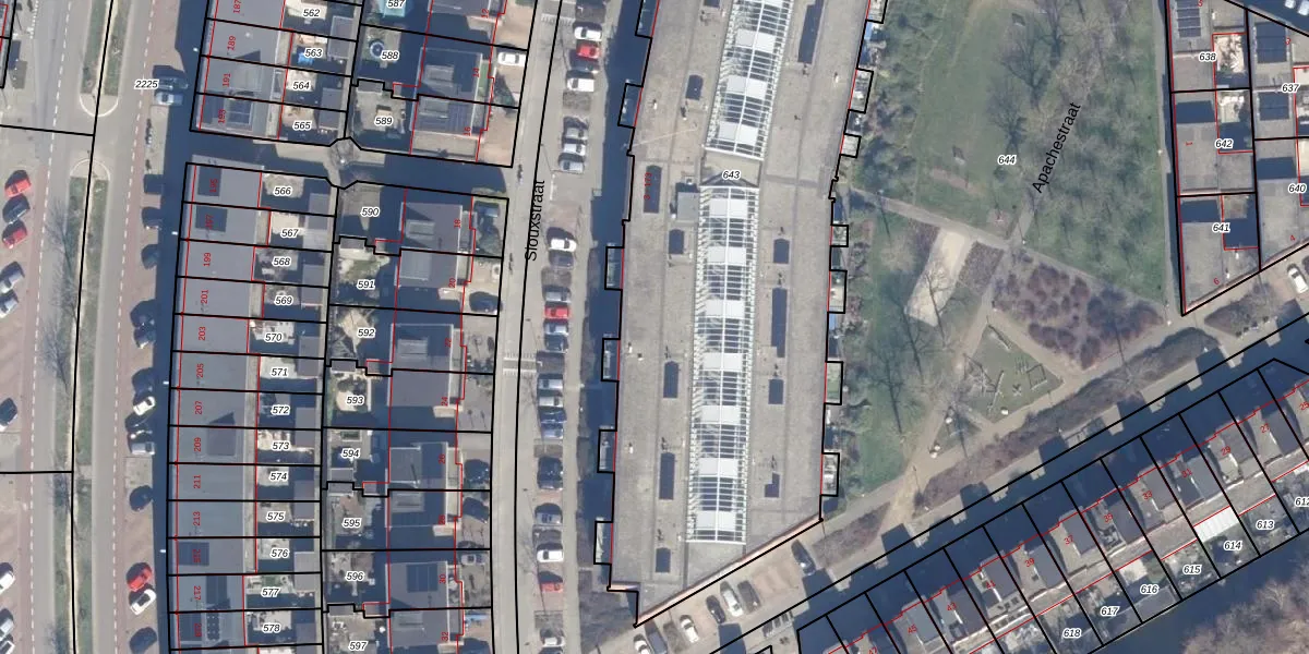 Het perceel waarop Siouxstraat 111 staat heeft een oppervlakte van 3945 m². Dit is een zeer groot perceel. De perceeloppervlakte wordt geregistreerd door het Kadaster. Gedetailleerde informatie over de maten van dit perceel kunt u vinden in het rapport Kadastrale kaart met maatvoering van Siouxstraat 111.