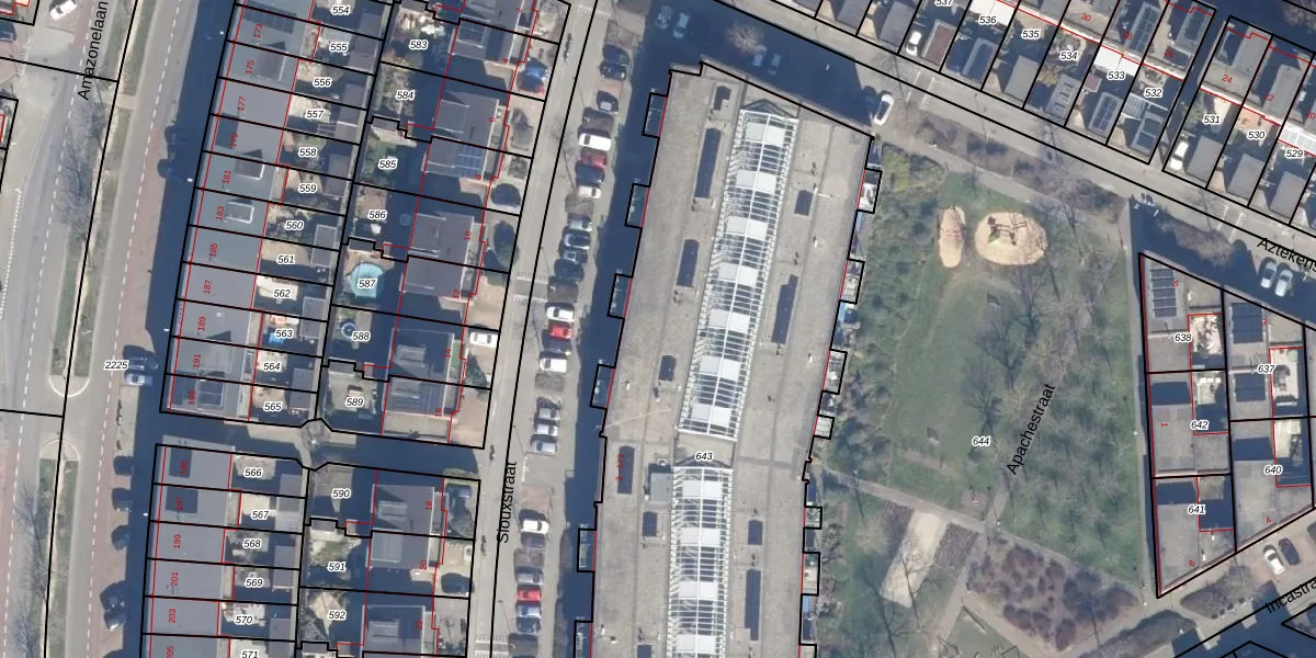 Het perceel waarop Siouxstraat 55 staat heeft een oppervlakte van 3945 m². Dit is een zeer groot perceel. De perceeloppervlakte wordt geregistreerd door het Kadaster. Gedetailleerde informatie over de maten van dit perceel kunt u vinden in het rapport Kadastrale kaart met maatvoering van Siouxstraat 55.