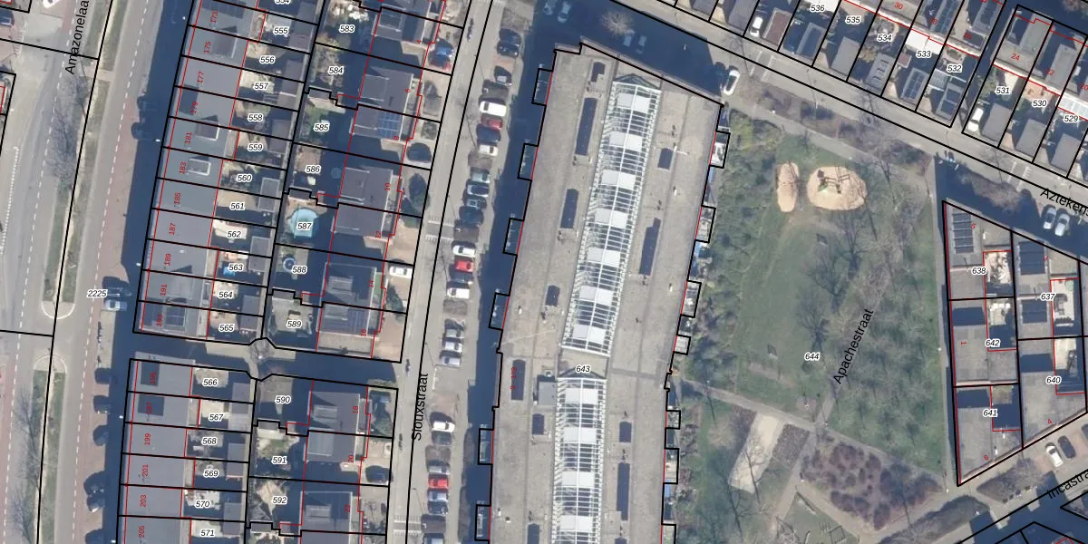 Het perceel waarop Siouxstraat 57 staat heeft een oppervlakte van 3945 m². Dit is een zeer groot perceel. De perceeloppervlakte wordt geregistreerd door het Kadaster. Gedetailleerde informatie over de maten van dit perceel kunt u vinden in het rapport Kadastrale kaart met maatvoering van Siouxstraat 57.