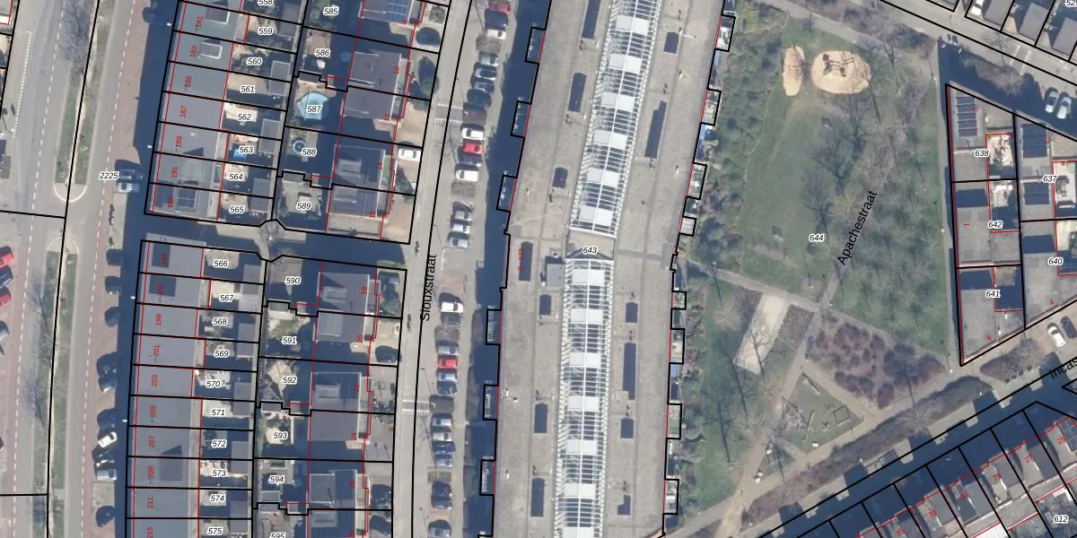 Het perceel waarop Siouxstraat 85 staat heeft een oppervlakte van 3945 m². Dit is een zeer groot perceel. De perceeloppervlakte wordt geregistreerd door het Kadaster. Gedetailleerde informatie over de maten van dit perceel kunt u vinden in het rapport Kadastrale kaart met maatvoering van Siouxstraat 85.