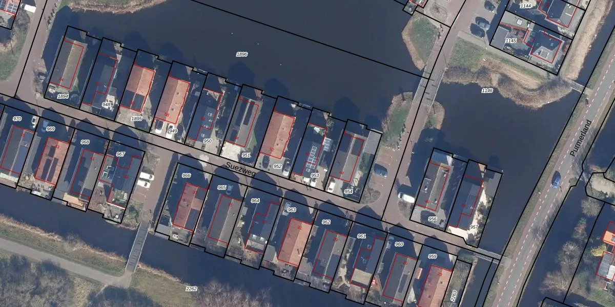Suezweg 50 is gelegen op kadastraal perceel PMR00O953. Deze kadastrale aanduiding is uniek en wordt gebruikt door het Kadaster om eigendomsrechten en andere zakelijke rechten vast te leggen. Het perceel maakt onderdeel uit van de kadastrale gemeente Purmerend.