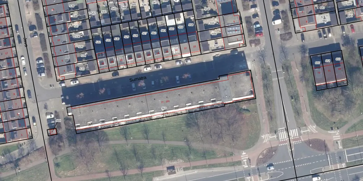 Het perceel waarop Sumatra 105 staat heeft een oppervlakte van 1565 m². Dit is een zeer groot perceel. De perceeloppervlakte wordt geregistreerd door het Kadaster. Gedetailleerde informatie over de maten van dit perceel kunt u vinden in het rapport Kadastrale kaart met maatvoering van Sumatra 105.