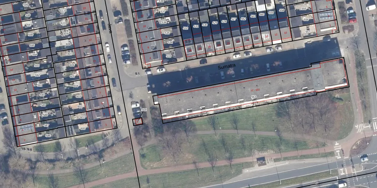 Het perceel waarop Sumatra 141 staat heeft een oppervlakte van 1565 m². Dit is een zeer groot perceel. De perceeloppervlakte wordt geregistreerd door het Kadaster. Gedetailleerde informatie over de maten van dit perceel kunt u vinden in het rapport Kadastrale kaart met maatvoering van Sumatra 141.
